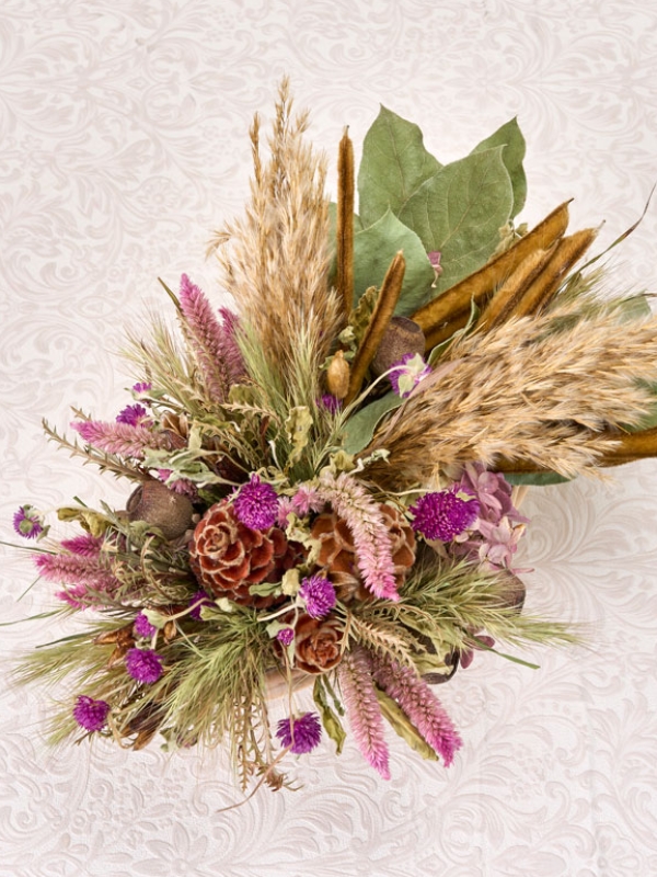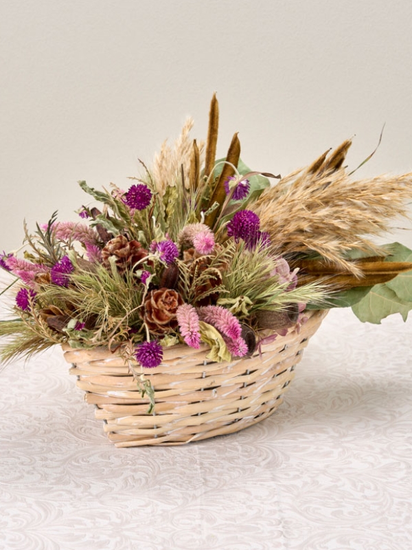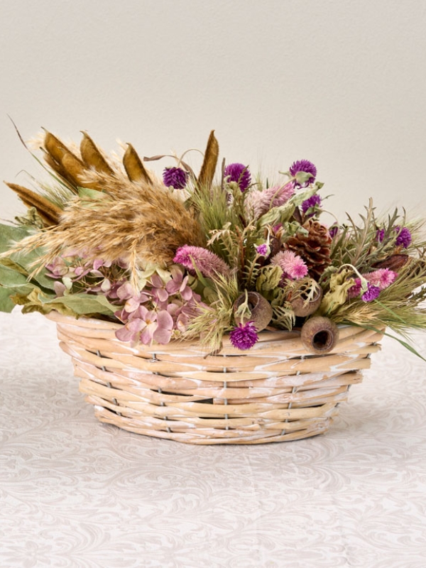 カットしたフォームをバスケットとワイヤーで固定し、ボンドを付けた花材をふんわりと挿していきます。
