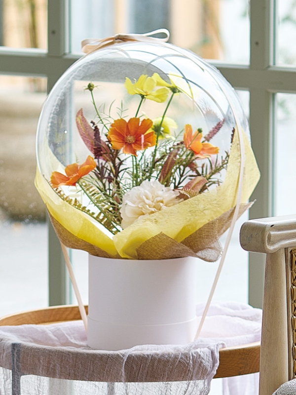 バルーンの上面をハサミでカットし、ブーケ状の花束を入れています。ボックスとバルーンを一緒にリボンで結んでいます。