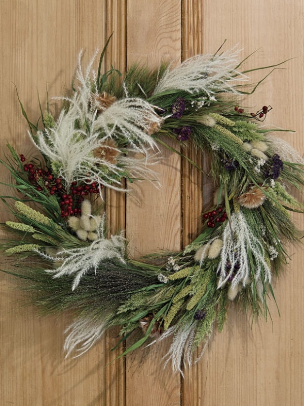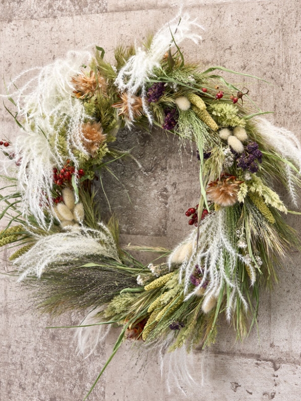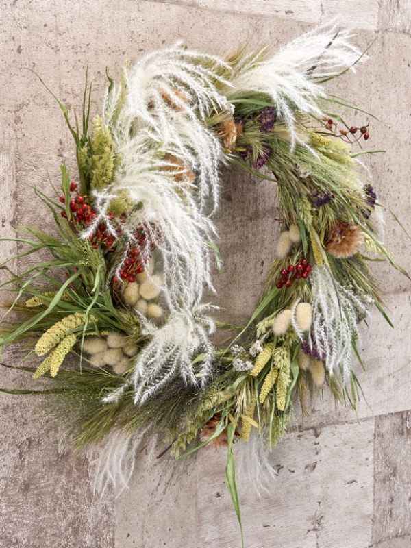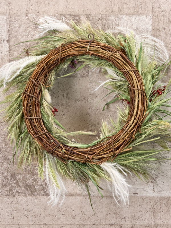 秋風にそよぐ穂先や緑の色合いを感じて季節の移ろいを表現したリースです。フワフワ素材のドライを束ねてリースに接着しています。