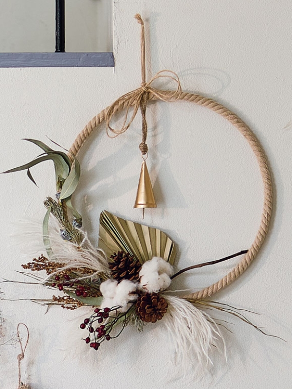 ロープリースに花束状にドライを束ねて、ワイヤーで留めています。