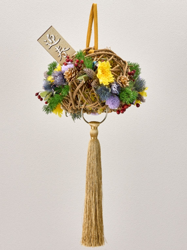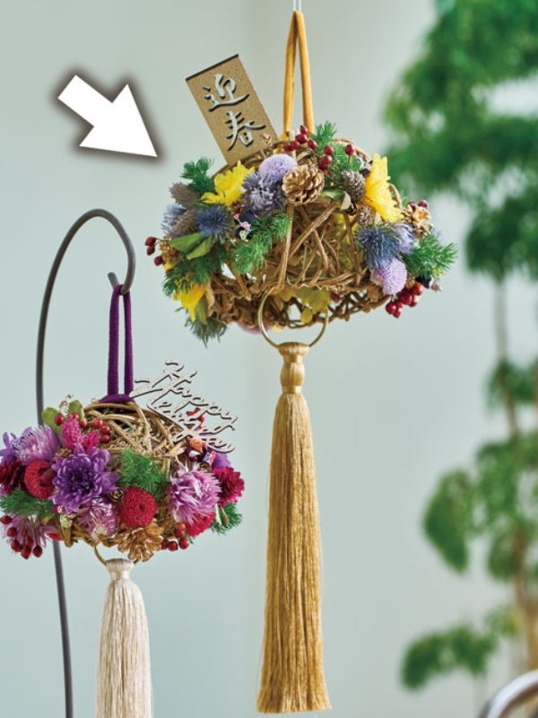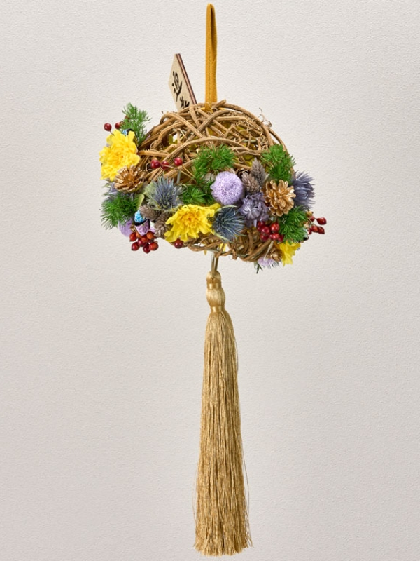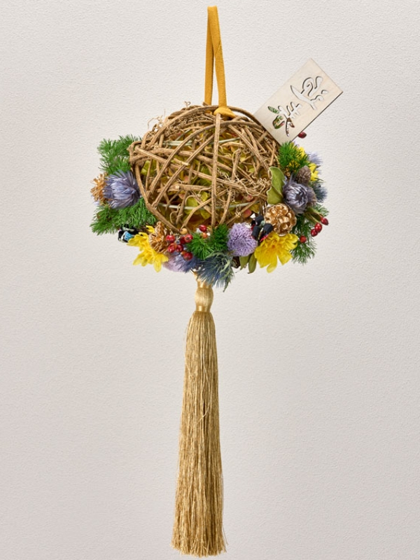 カーリーボール大にカラードライやプリをグルーで貼っています。カーリーボールの中には素ボールとタッセルを付けた紐を通しています。素ボールにはプリアジサイをグルーで貼っています。