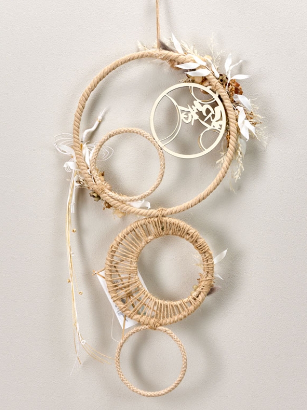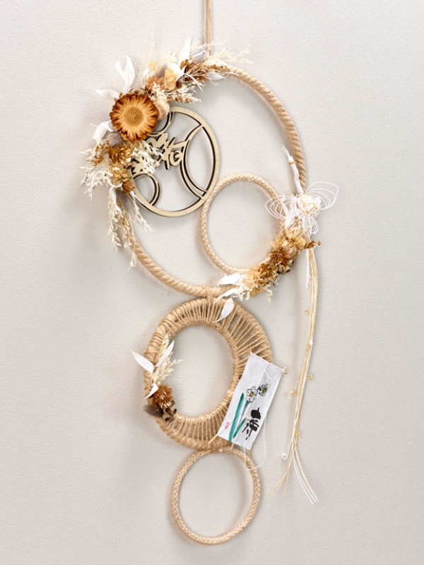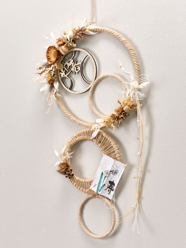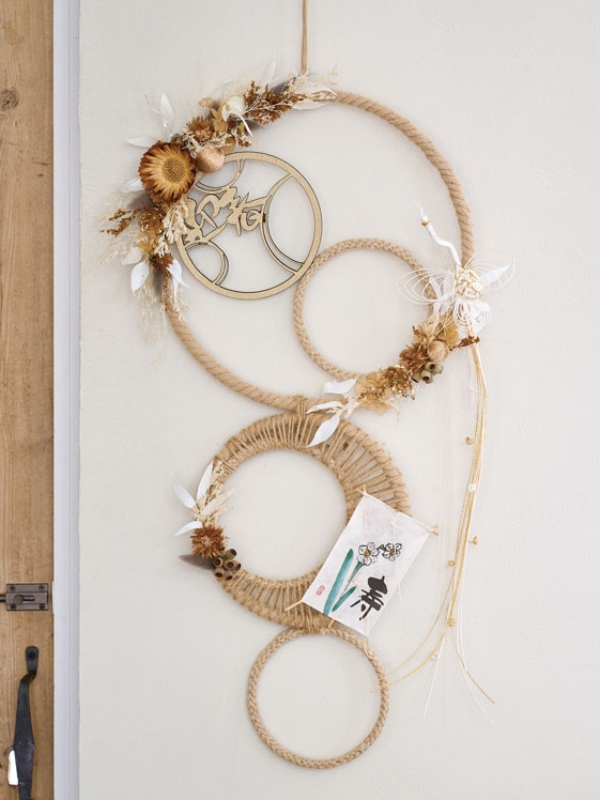 大小のロープリースやワイヤーオーナメントを繋いでベースにしています。ワイヤーオーナメントは一部をカットしてジュートコードを通しています。