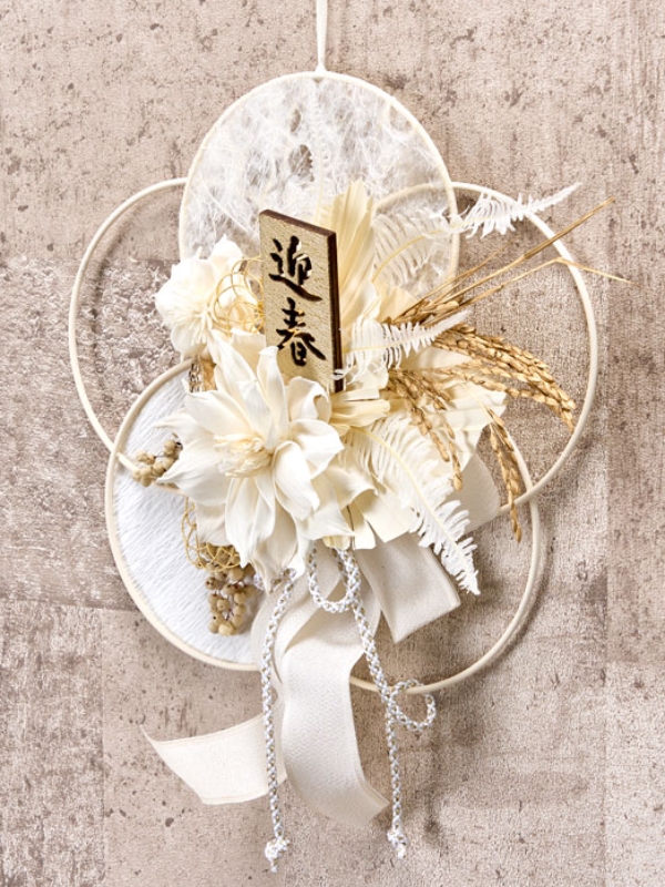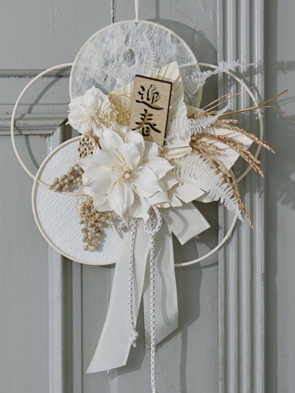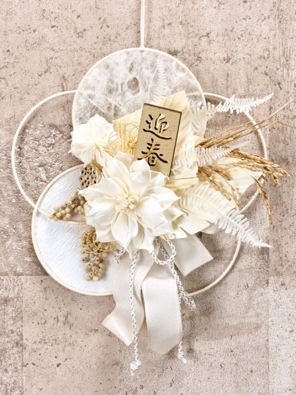 ペーパーはアドヒーシブ、花材はグルーで接着しています。 白に統一することで素材感げ際立ちます。