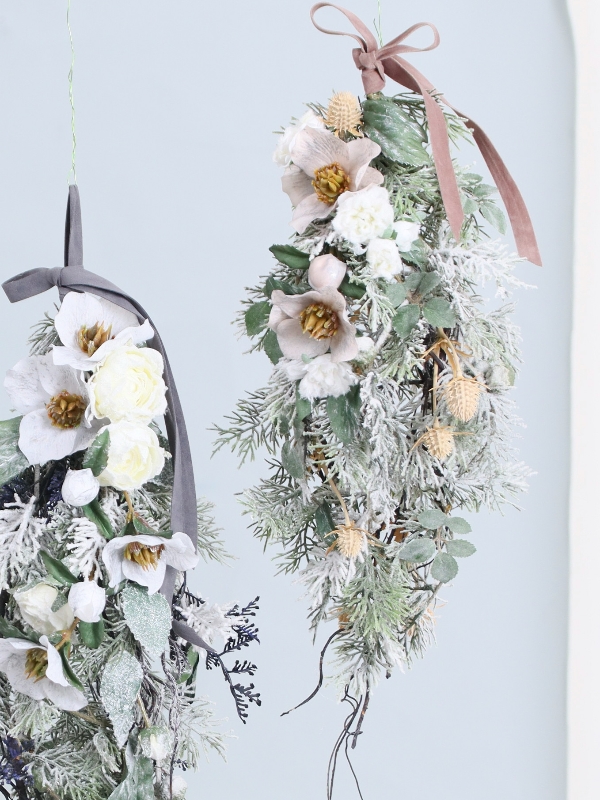 北欧風のスノー(雪掛け風)フラワーのスワッグ。