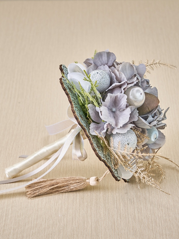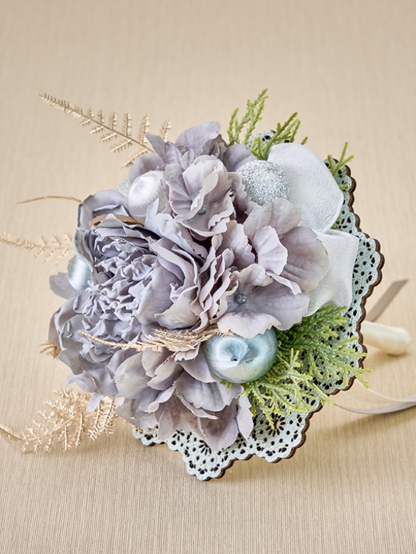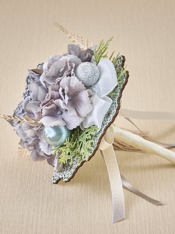 フルールプレートの真ん中にブーケ状に束ねた花束を一体化しています。アイビーピックとプレートをアドヒーシブで接着しています。