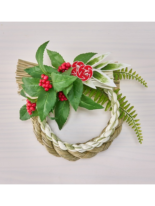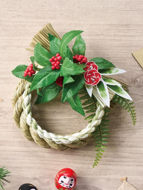 しめ縄とラタン飾りを重ねて、材料をグルーで接着しています。ラタン飾りの色に合わせて爽やかな色合わせにしています。