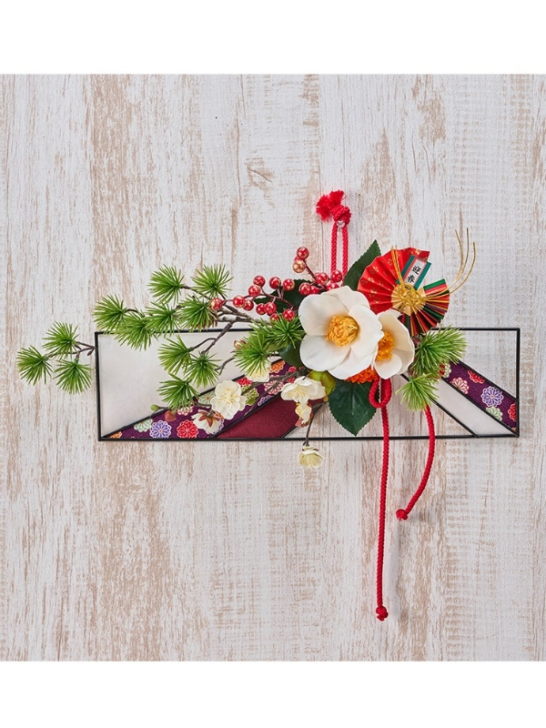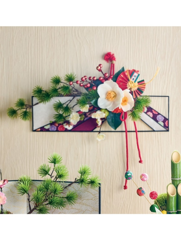 ワイヤーベースにアドフィーシブをつけ、ペーパーやリボンを貼り合わせます。花材はまとめてワイヤーでとめつけます。重みのバランスがとりにくい場合は、2か所で吊るします。
