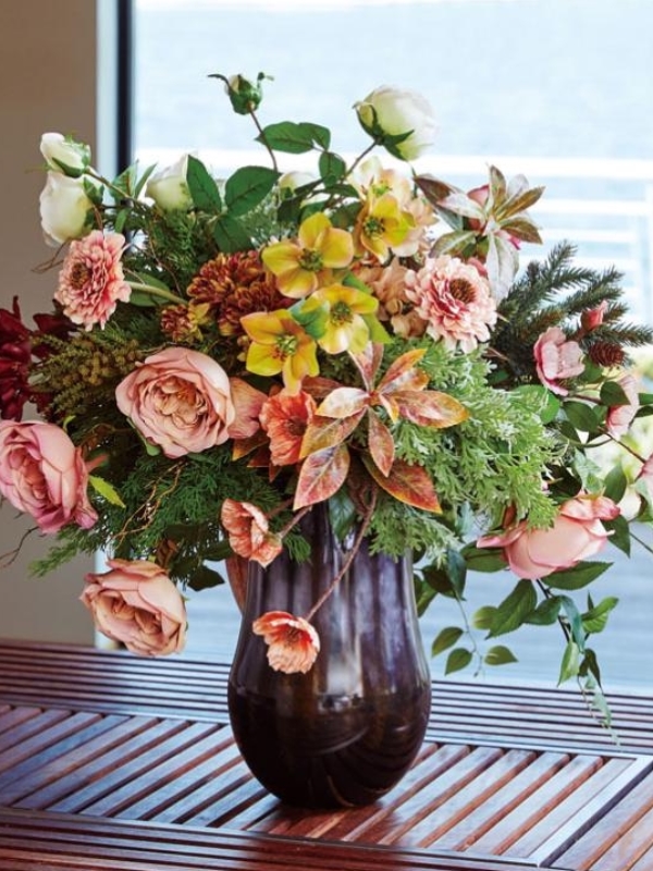 少しくすんだカラーで揃えたローズとクリスマスローズのアレンジ。