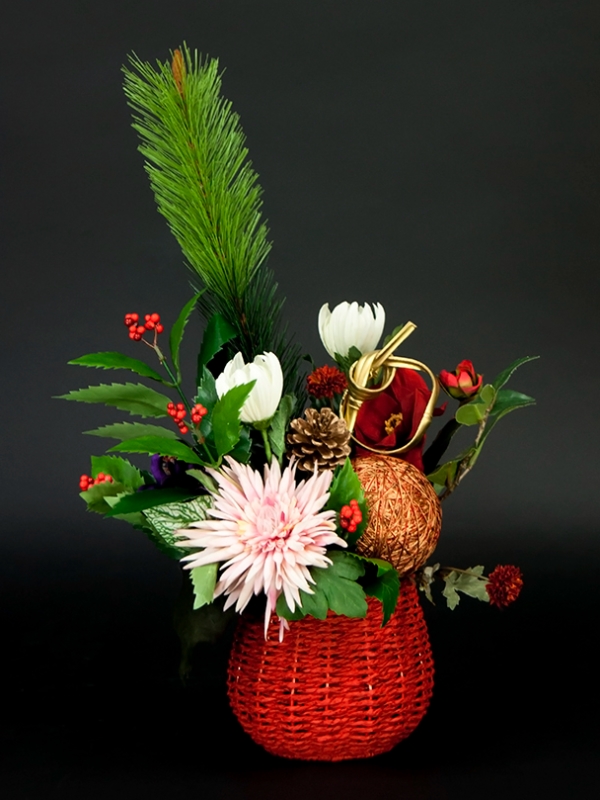 赤い色がお祝いの雰囲気をアップする、丸フォルムのバスケットを使用した和風アレンジメントです。