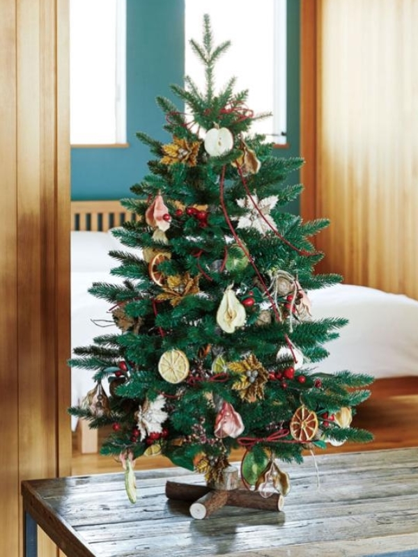 フルーツとポインセチアオーナメントで楽しむミニツリー。