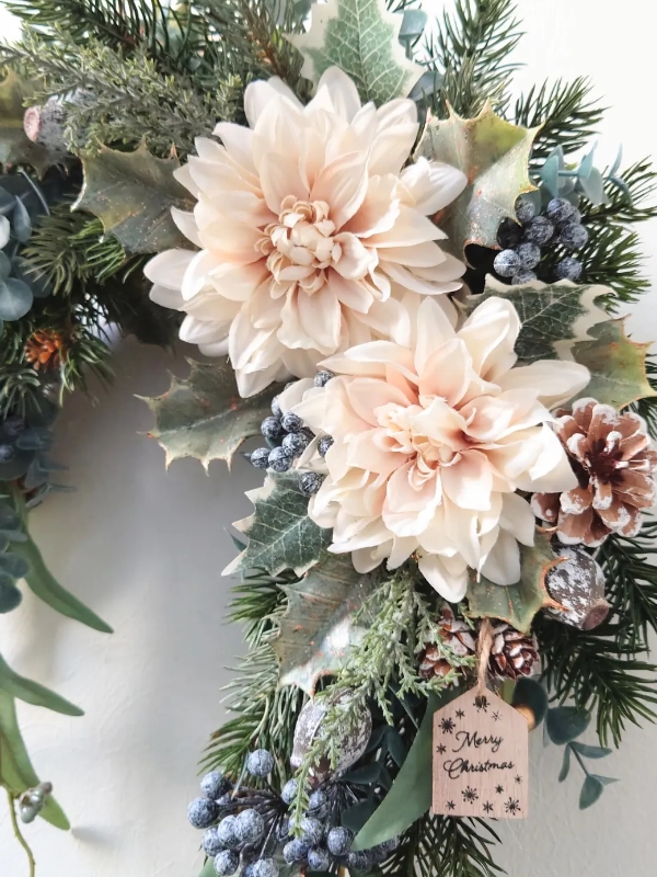 クリームホワイトのダリアと、アンティーク感のあるクラシックホリーが、シャビーな雰囲気を出してくれました。