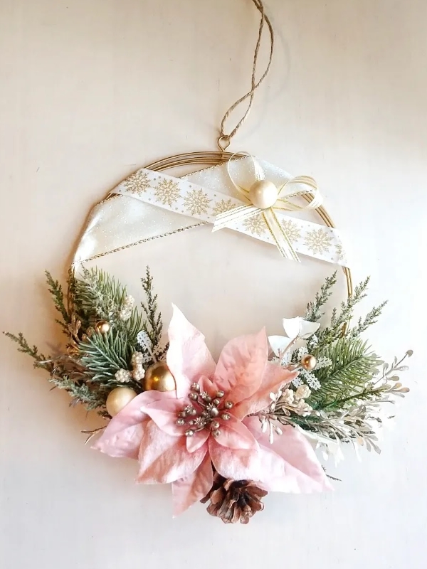 アンティークゴールドのリースをベースに、ほんのり煌めきのあるサーモンピンクのポインセチアをメインにアレンジしました。