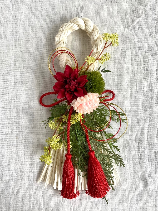 白いラタンのしめ縄に赤いダリアと淡いピンクのポンポン菊、
