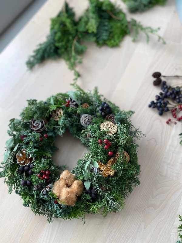 フレッシュなグリーンの香りに包まれながら、多種類のグリーンを手編みして、大きなクリスマスリースを作りました。