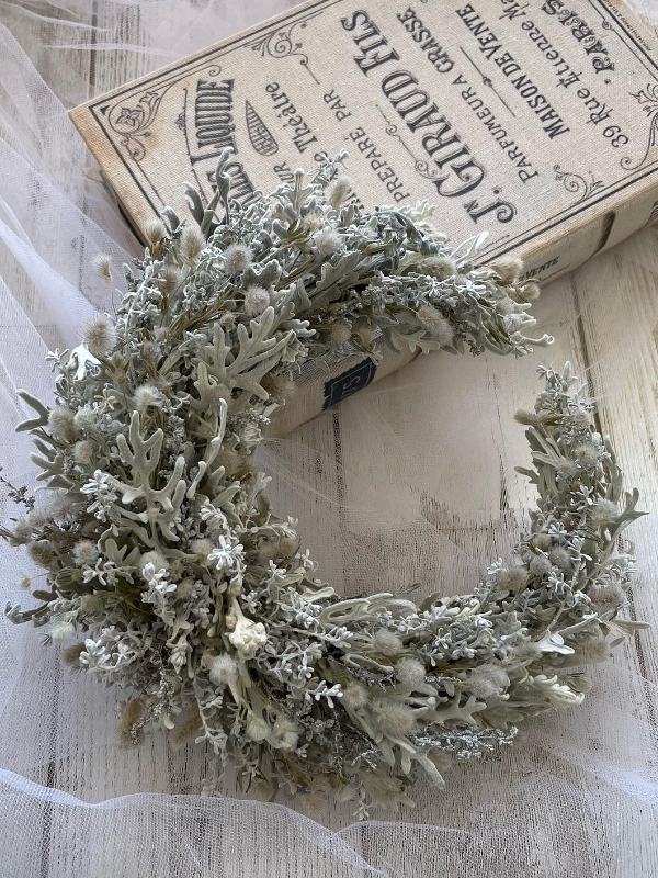 グレイッシュな花材を集めた三日月リースです。