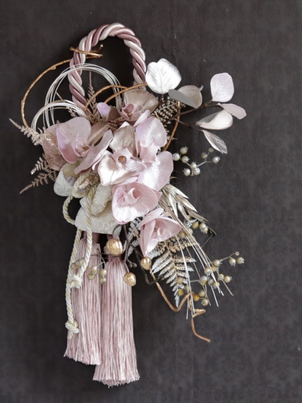 たっぷりの房がリッチなロープタッセルにベルベット調の胡蝶蘭をあしらい、ユーカリ、シダ、サンキライもニュアンスカラーでまとめて、とてもおしゃれな雰囲気に仕上がっています。