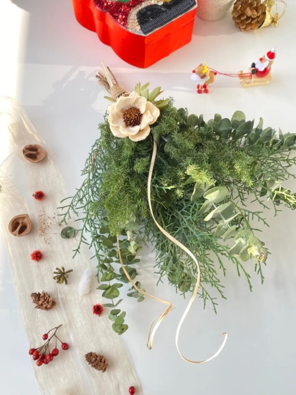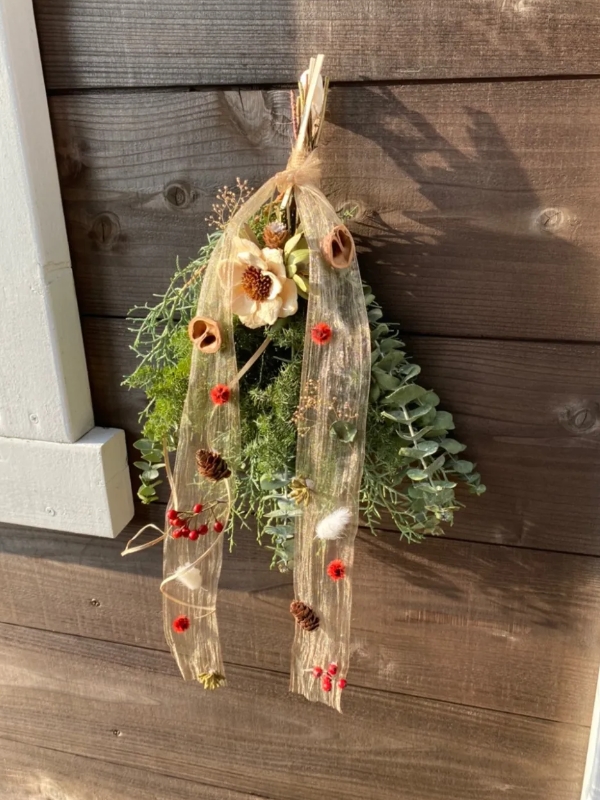 フレッシュグリーンをたっぷり使ったスワッグに、取り外し可能なクリスマス感あるリボンをおつけしました。