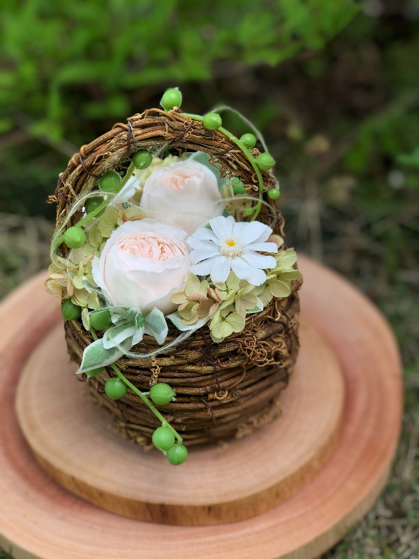 ほんとうに咲いているような瑞々しさを感じる花たちが、かごの中からそっと癒しを放っています。