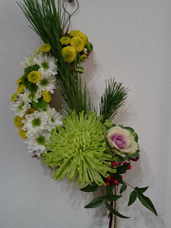 松を上下で固定し、形を安定させてから、生花を飾りました。