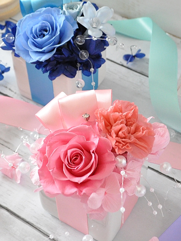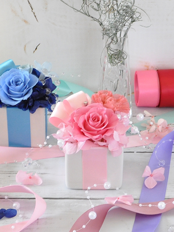 白い陶器の器をプレゼントボックスに見立てた、プリザアレンジです。