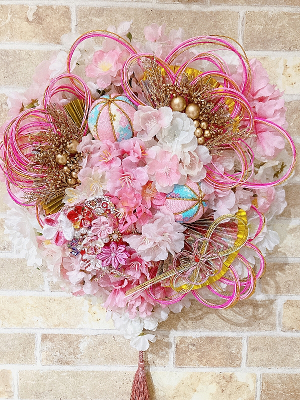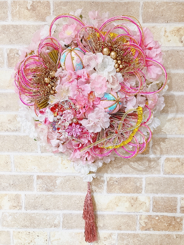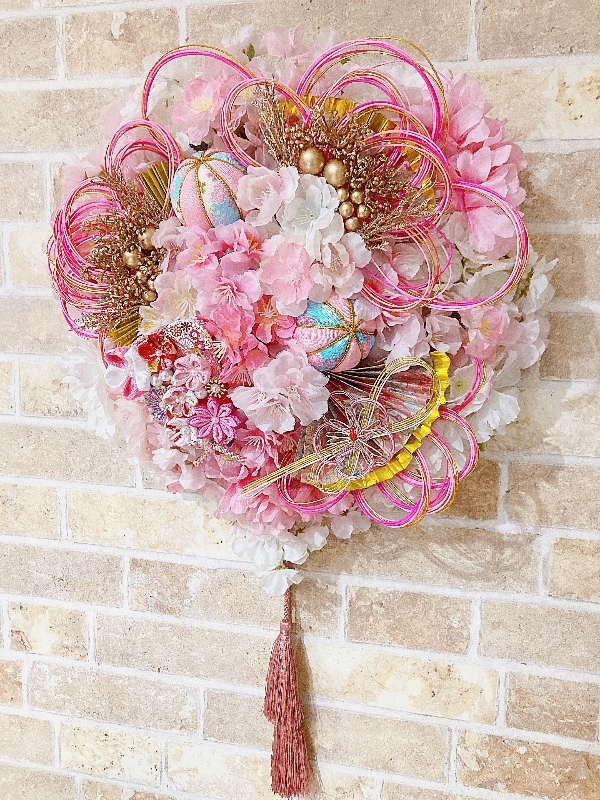ご覧頂き誠にありがとうございます♡沢山の八重桜、ソメイヨシノ、ちりめん細工の羽子板飾り、手毬を使ってアレンジしたひな祭りにオススメのリースです(o^^o)