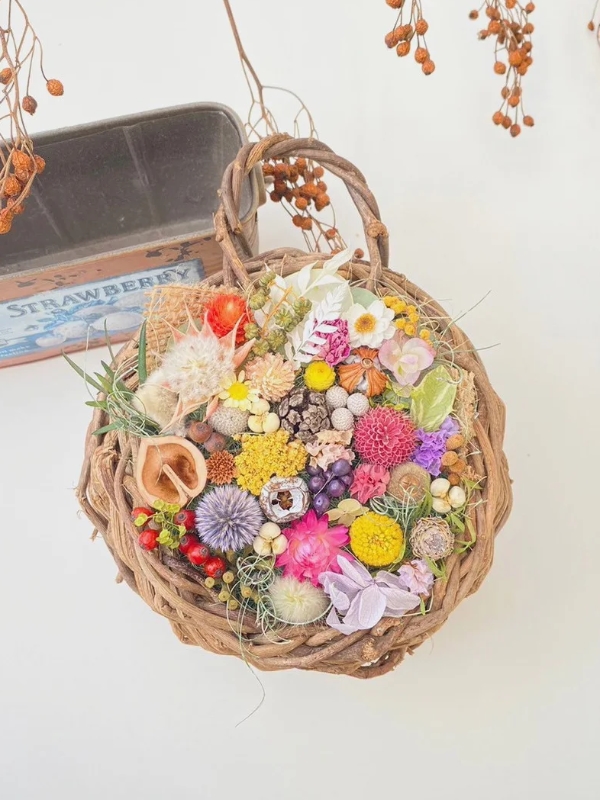 待ち遠しい春を予感させるようなお花いっぱいのかご飾りです。