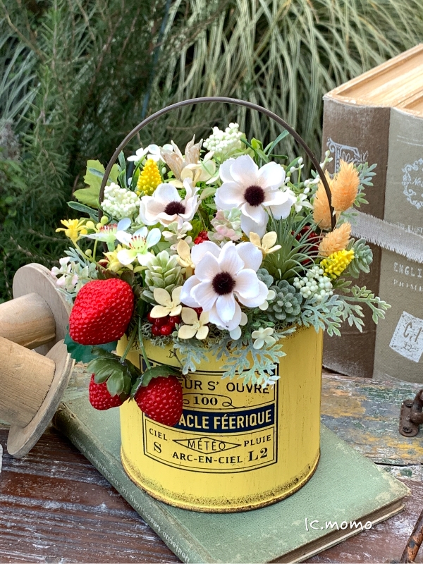 ビタミンカラーのブリキ缶にナチュラルにアレンジしました。