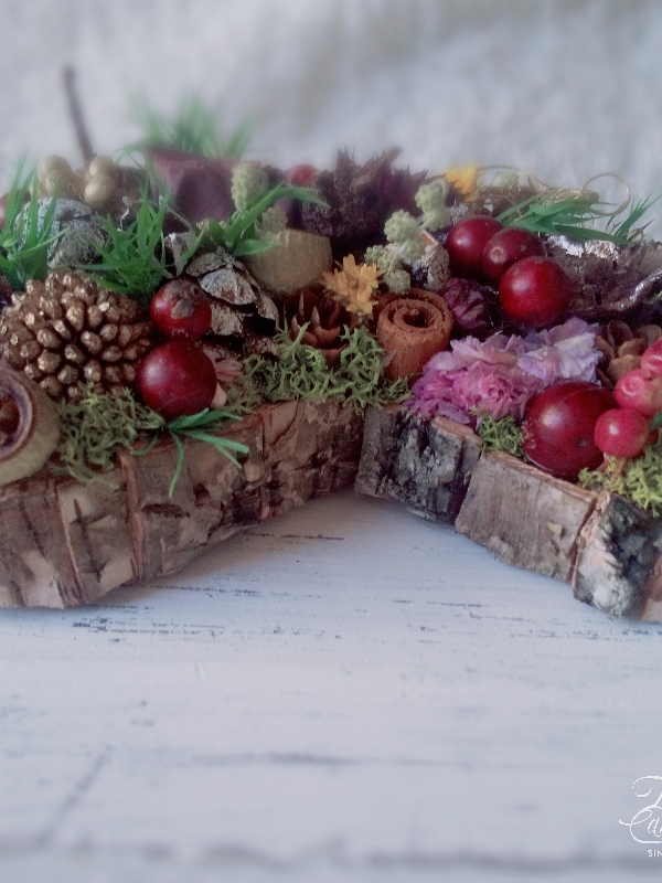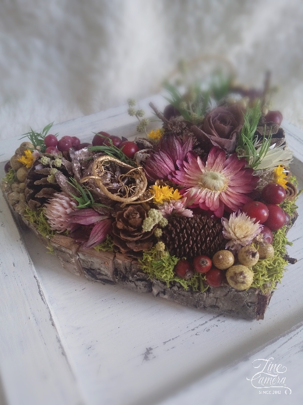 ナチュラルな風合いの真っ白なボードに、お花のハートを載せてみました。