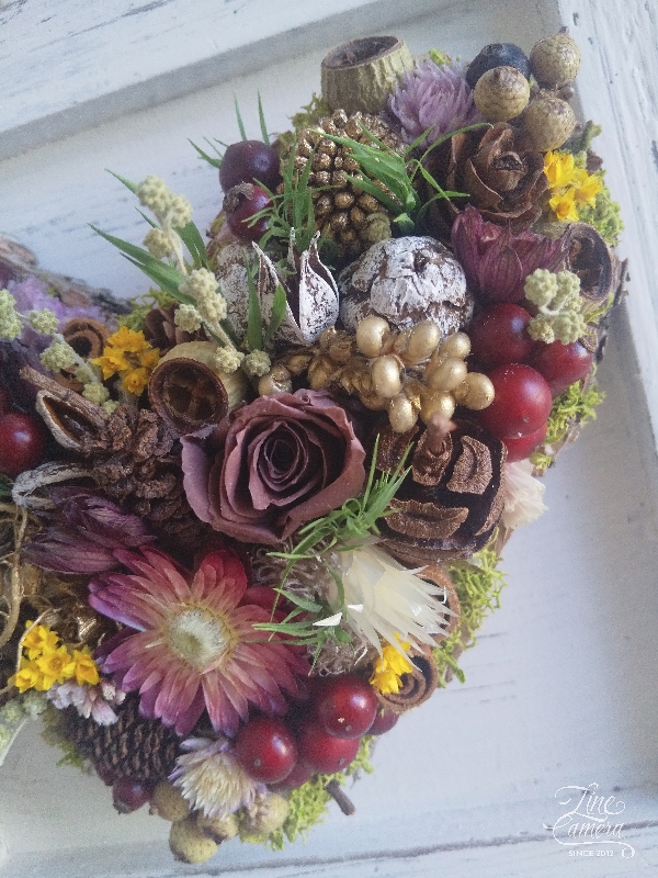小さなフラワーボードですが、たくさんのお花や木の実を使ってあるため、さりげない華やかさがあり、玄関、リビング、書斎、寝室など、場所を選ばず飾っていただけるかと思います。