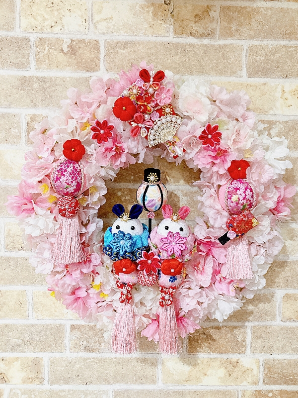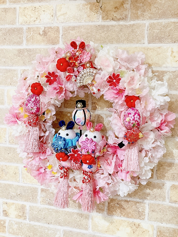 沢山の八重桜に手作りの手毬にちりめん細工のうさぎのお雛様とお内裏様、数種類のちりめん細工のお花、ぼんぼり、羽子板飾りを使って豪華で華やかなひな祭りリースにアレンジしました(o^^o)