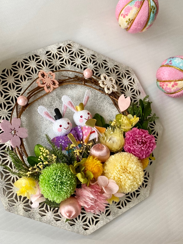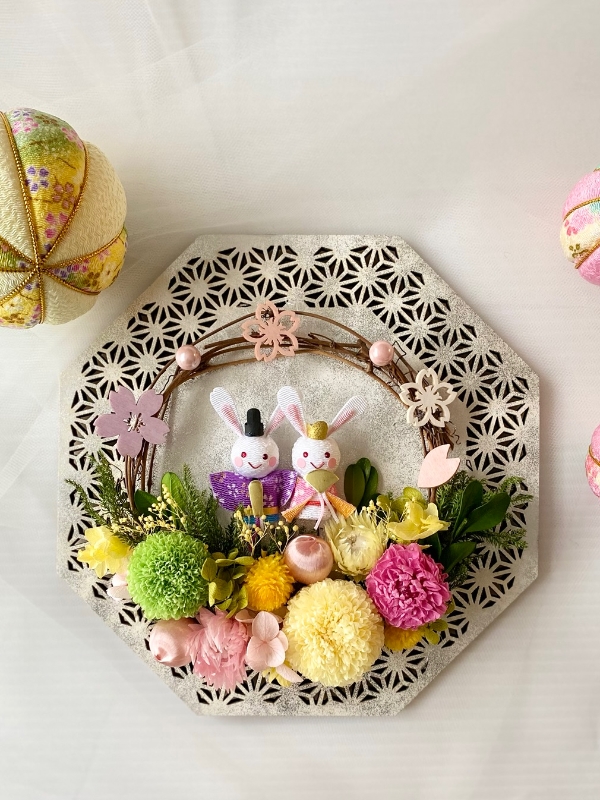 プレートにひな祭りをイメージしたリースをデザインしました。