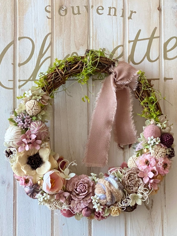 プリザーブドのサンウィーバインを絡めてナチュラルに、落ち着いたローズ色のリボンを結んで甘すぎない印象に仕上げてみました。