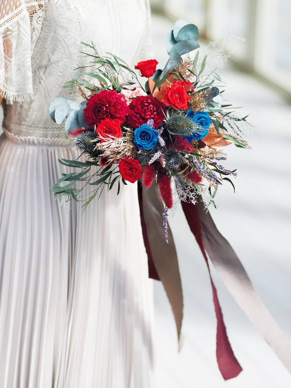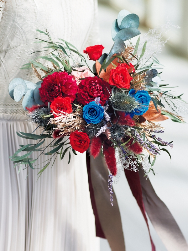 ダリアとビビッドカラーが個性的なブライダルブーケ