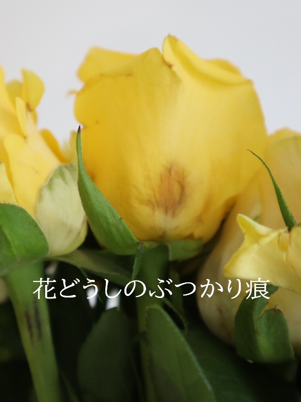 花弁先傷、外弁の裂傷、一部の黒変、花同士のぶつかり痕などみられる場合があります。