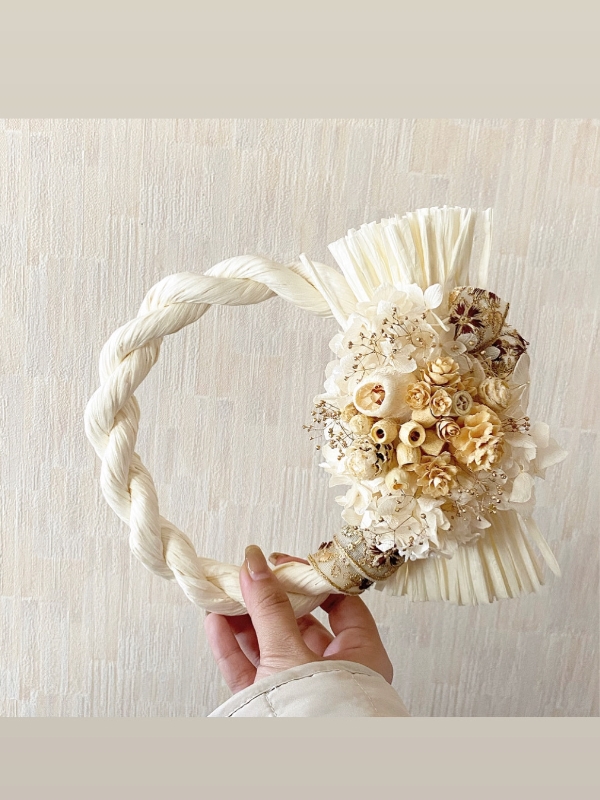 ホワイトカラーで統一したナチュラルなしめ縄リースです!