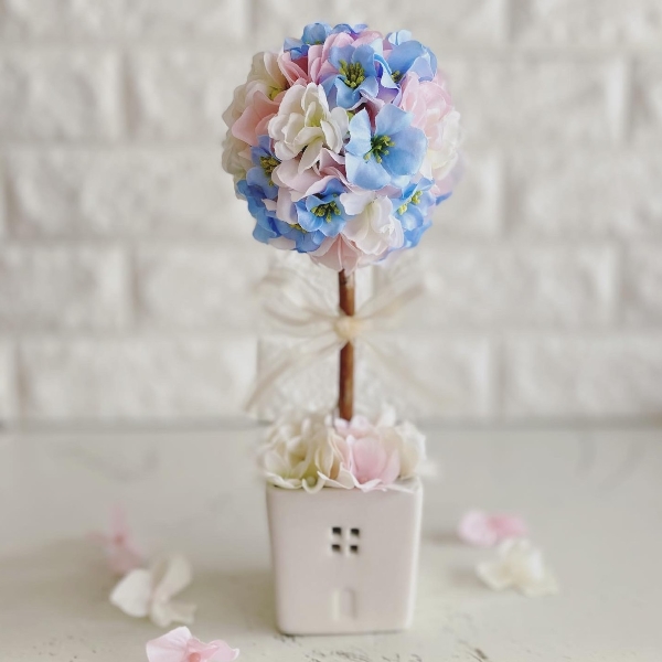 ピンク・ライトブルー・クリームグリーン・ホワイトなどミルキーな色合わせでトピアリーを作りました