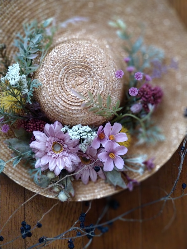 くすみピンクのガーベラや小花で、ちょっぴり少女気分を感じられる麦わら帽子アレンジです。