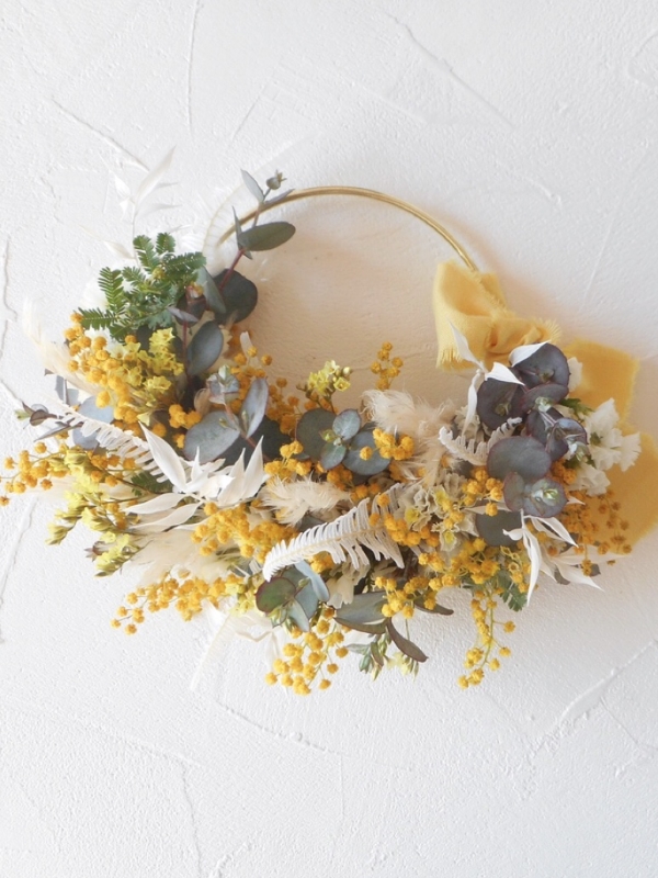 真鍮をベースにしたお洒落なミモザのリース