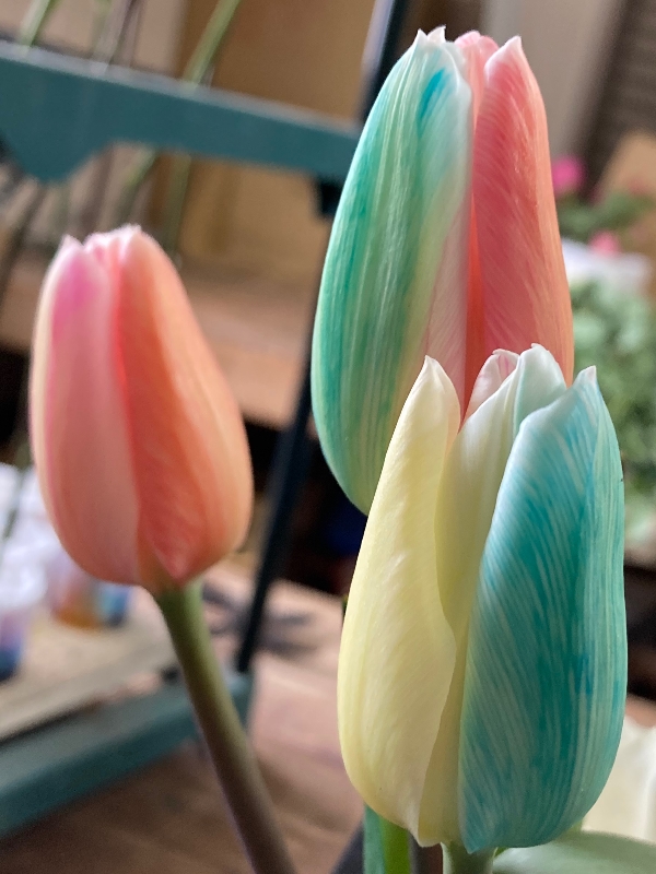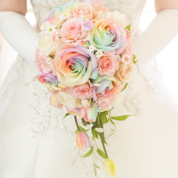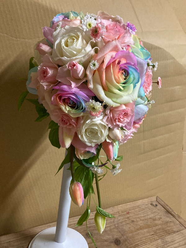いつか白チューリップをレインボーに染めてみたいと思っていたら、お客様から、凄く淡いレインボーローズを使ったブーケを頼まれたので、季節的にチューリップが、買えたので、はなどんやさんで購入したチューリップをレインボーに染めて、ブーケに使いました。