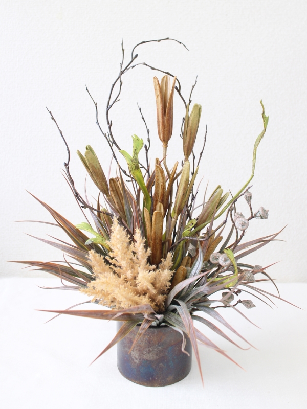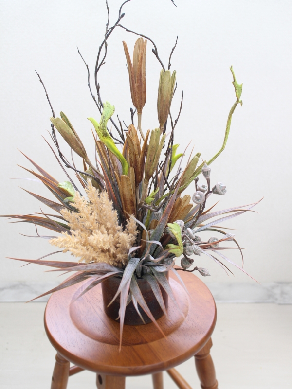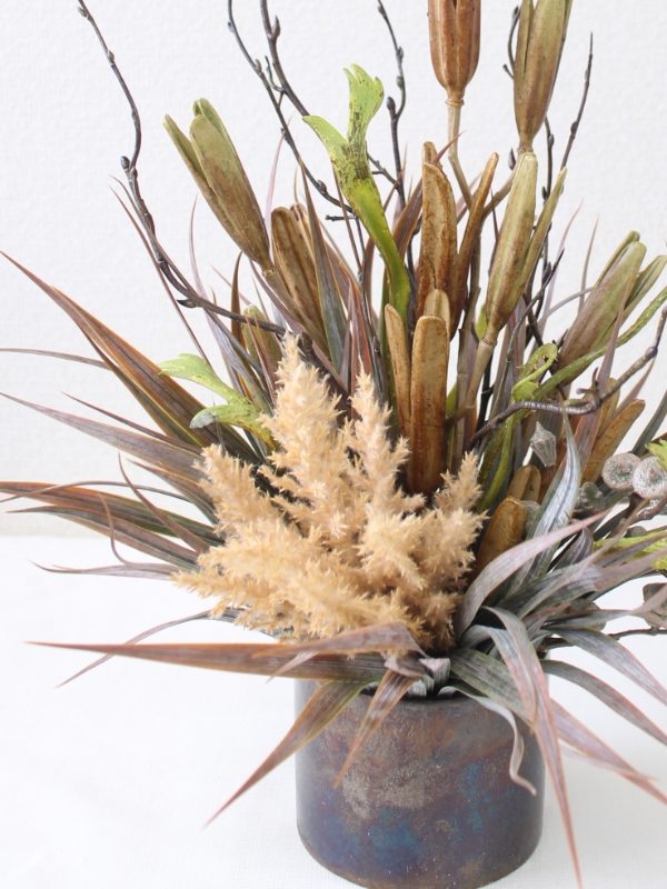 リリーシードとパンパスを使ったドライ風アレンジメントを作りました。色味は淡いベージュやネイビー、ブラウンなど、落ち着いたトーンでまとめました。リリーシードは縦長の形状を活かして、斜めに配置し、パンパスは柔らかく添えて挿しています。アレンジ全体にはラフな質感を出すために、アクセントに少しのグリーンを加えています。ドライフラワーのような風合いで、落ち着いた雰囲気のアレンジメントとなっています。