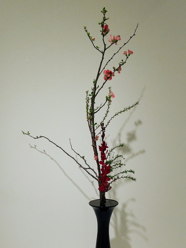 正風体生花 木瓜、雪柳、アランダ▪ルージュレッドの三種生けです。