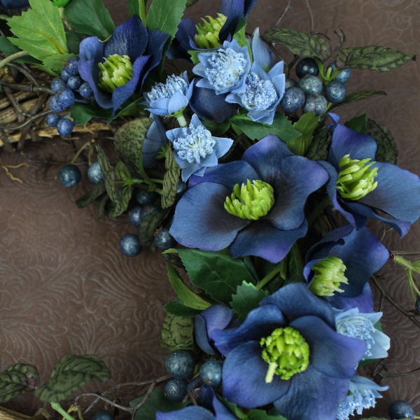 美しい青いクリスマスローズを中心に構成された、素晴らしい季節のリースです。クリスマスローズは、冬の寒さにも耐えるため、クリスマスシーズンには特に人気があります。クリスマスシーズンにある素晴らしい装飾品として、家やオフィスの壁、ドア、または窓に飾るのに最適です。
