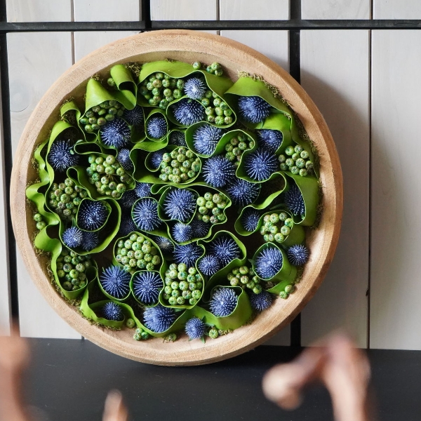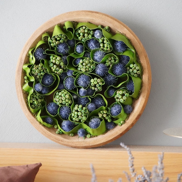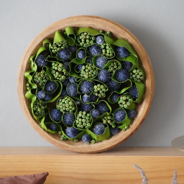 美しい青みがかったラベンダー色のアザミを中心に、アイビーベリーが散りばめられた優雅なアレンジメントです。アザミの美しい色合いと、アイビーベリーの爽やかな緑色が、お部屋に清々しい印象を与えます。