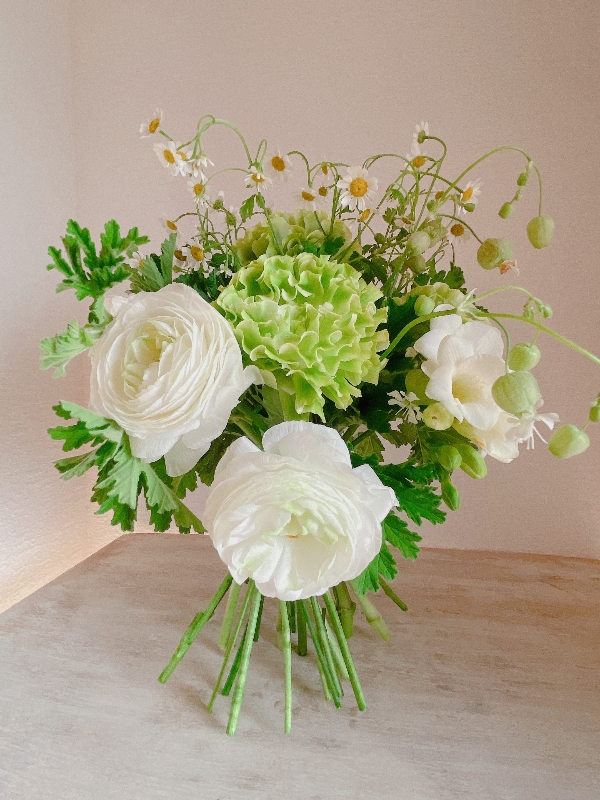ホワイトとグリーンのラナンキュラスをメインに、春の花達を束ねたナチュラルなガーデンブーケです。
