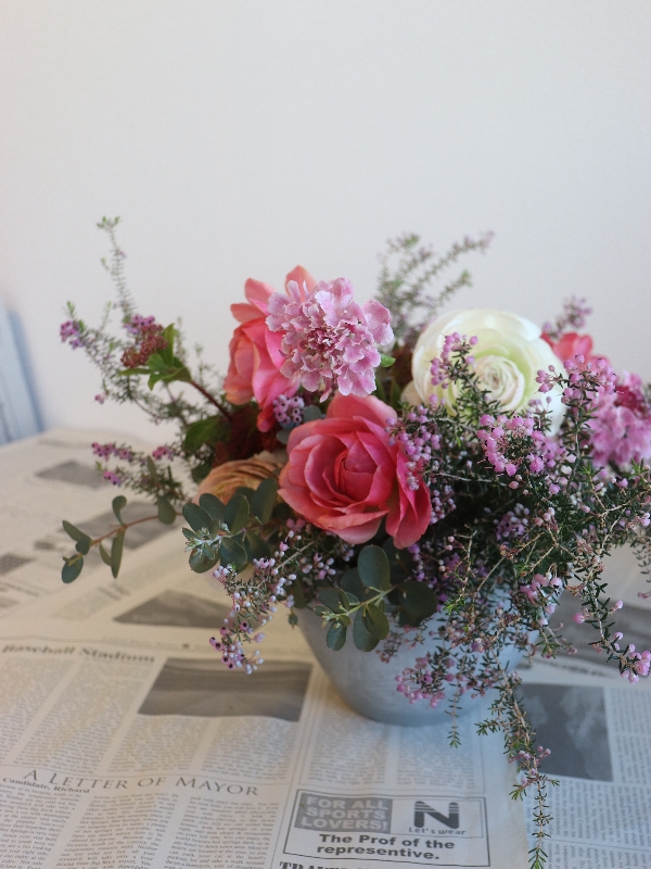 渋めの色合いの枝ものと合わせてアレンジしました。
