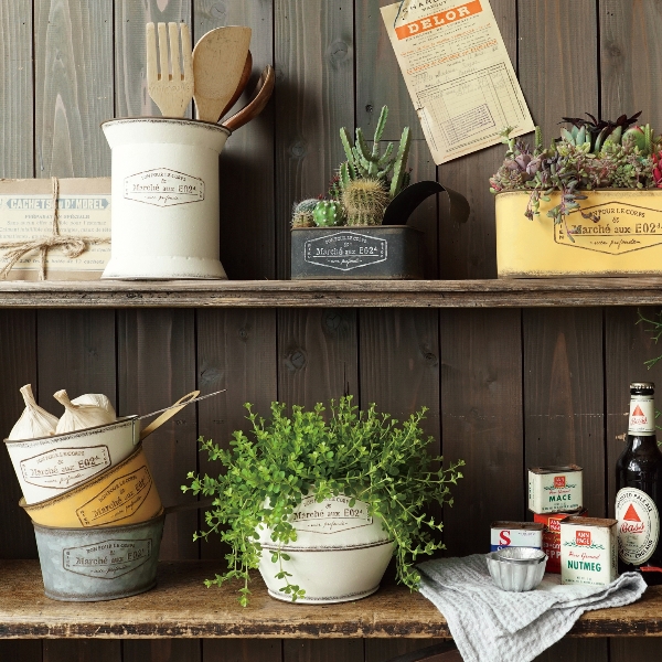 キッチンの調理器具をモチーフにしたブリキ製の鉢。