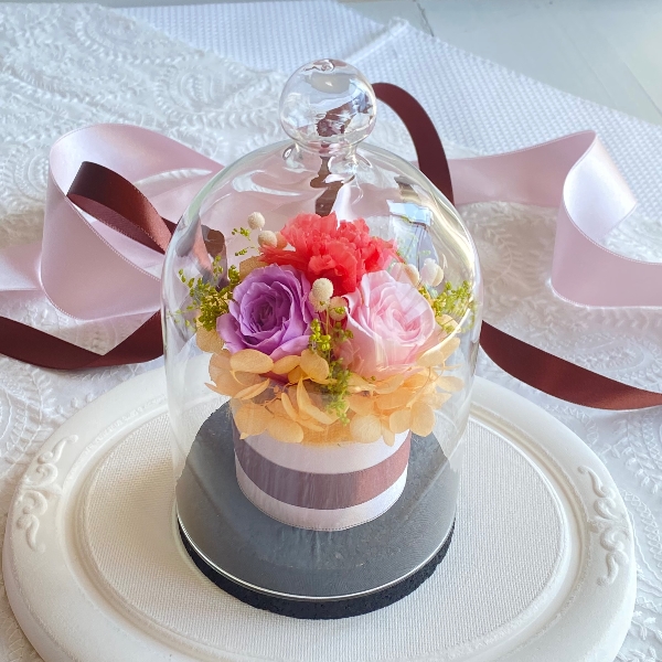 桜をモチーフにしたリボン土台に色とりどりの花々でアレンジしました。ガラスの中に小さな花束が思わずウフフっとほっこり♪