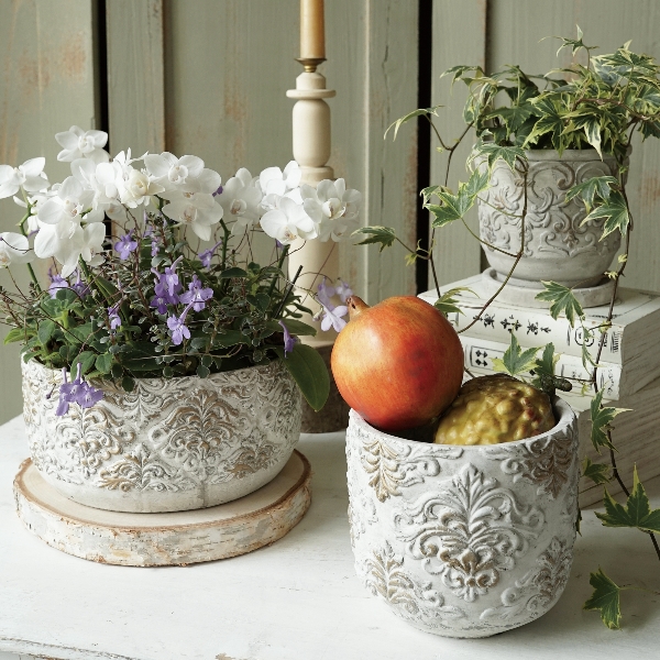 可愛い動物のオブジェをはじめ、アフリカンやエスニック系のかっこいい系、アラベスク柄やダマスク柄といったエレガント系のものまで、どなたでもお取り扱いいただけるように幅広いジャンルのデザインの鉢を数多く企画開発しております。