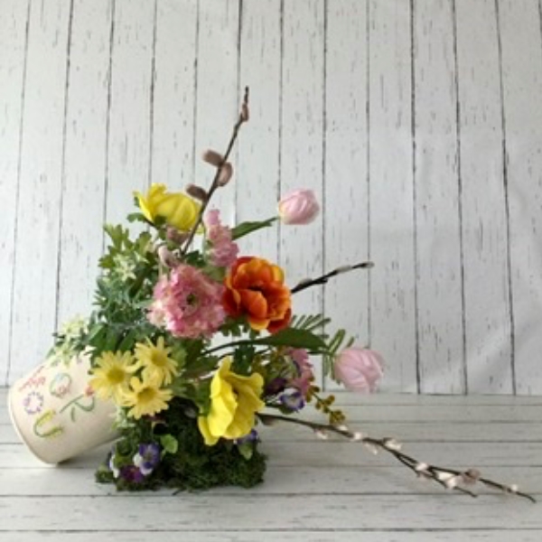 この日を待ち構えた草花は器からこぼれそうです。