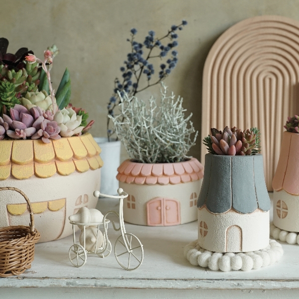 可愛らしいパステルカラーが特徴的な、ハウスモチーフのセメント製の鉢。